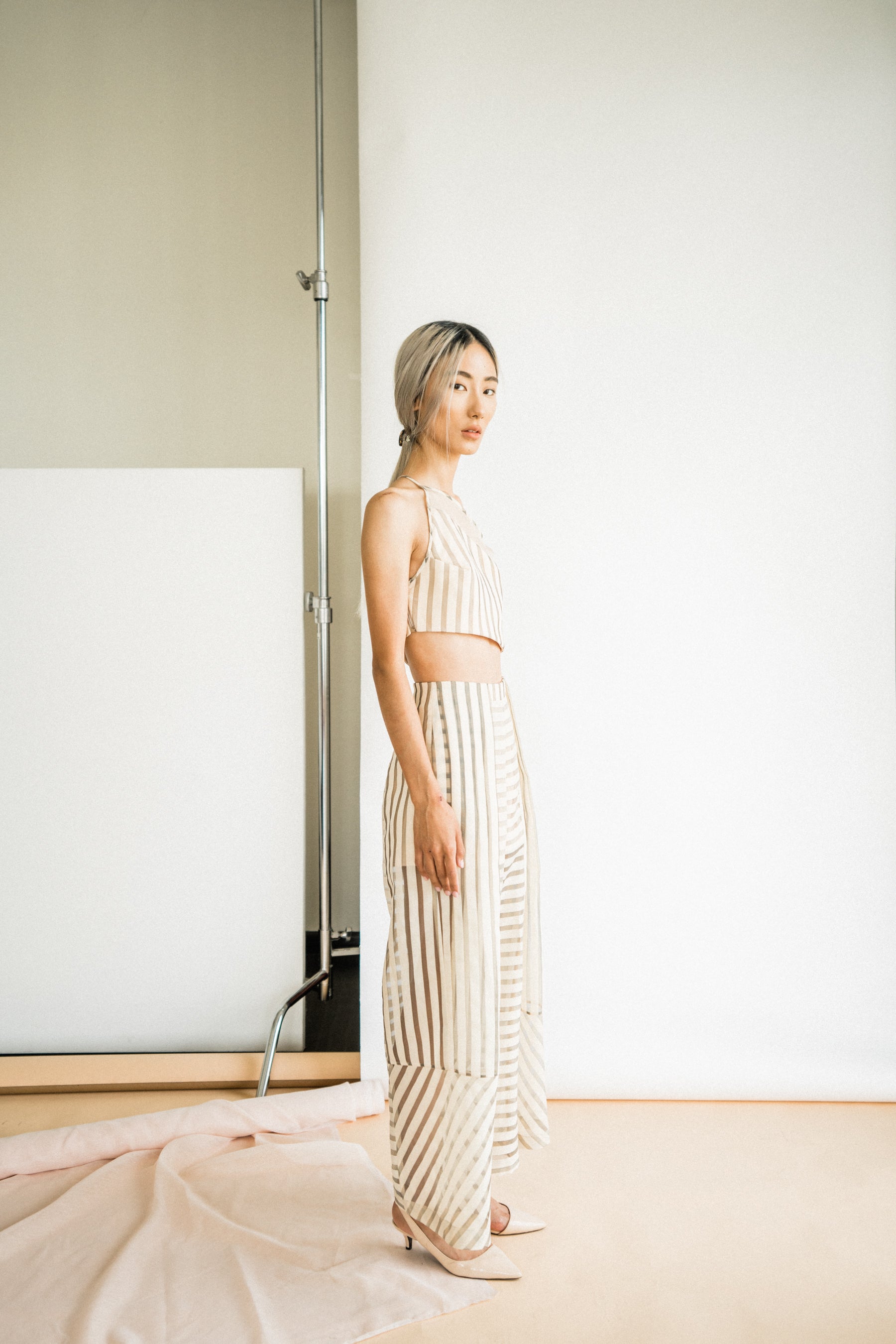 Semi-sheer, wide leg pants with pockets and alternating stripe details. Fold over pleat detail at front to create motion during movement.